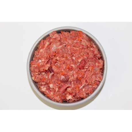 50% kuřecí prsa s kůží, 20% krůtí skelet, 20 % sezónní zelenina, 10 % králičí droby