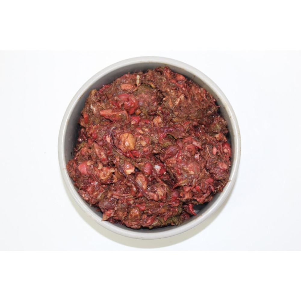 Složení: 40% zvěřina ořez, 30 % krůtí skelet, 30% zelenina (červená řepa a zelí).