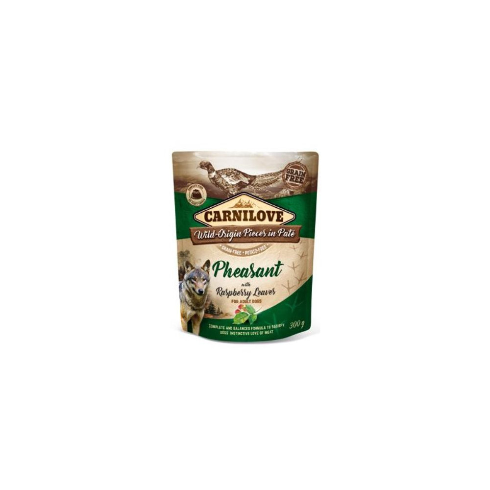 Carnilove Dog Pouch Paté Pheasant with Raspberry Leaves je kapsa s kousky masa a vnitřností divokého původu v paštice určená pro psy. Kapsu je možné použít jako kompletní krmivo nebo chutný topping ke granulím. Bez obilovin, bez brambor, bez GMO, bez sóji, bez konzervantů a barviv.