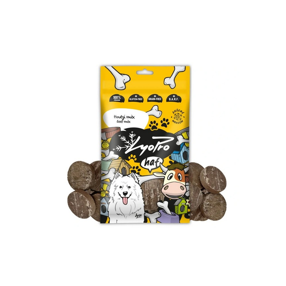 Hovězí mix nabízí vyváženou kombinaci masa a vnitřností, která obsahuje všechny důležité živiny pro zdraví vašeho psa. Díky šetrnému sušení mrazem zůstávají zachovány přirozené vitamíny, minerály, enzymy a další cenné látky. Maso si uchová svou přirozenou strukturu, vůni i chuť – jako čerstvé.