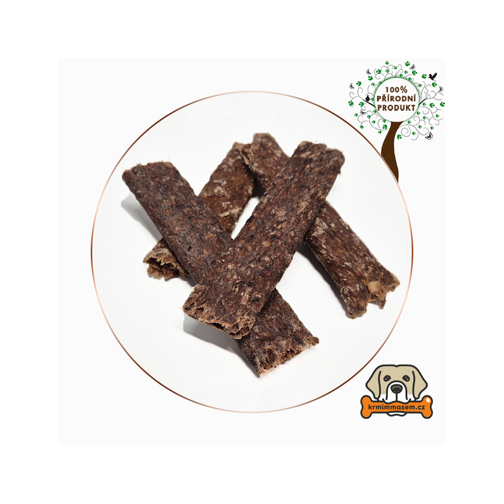 100% přírodní masové proužky – SRNČÍ jsou čistě masový pamlsek vyrobený z lisovaného a šetrně sušeného srnčího masa. Bez chemie, bez soli, bez barviv – jen poctivé maso v praktických tuhých proužcích.